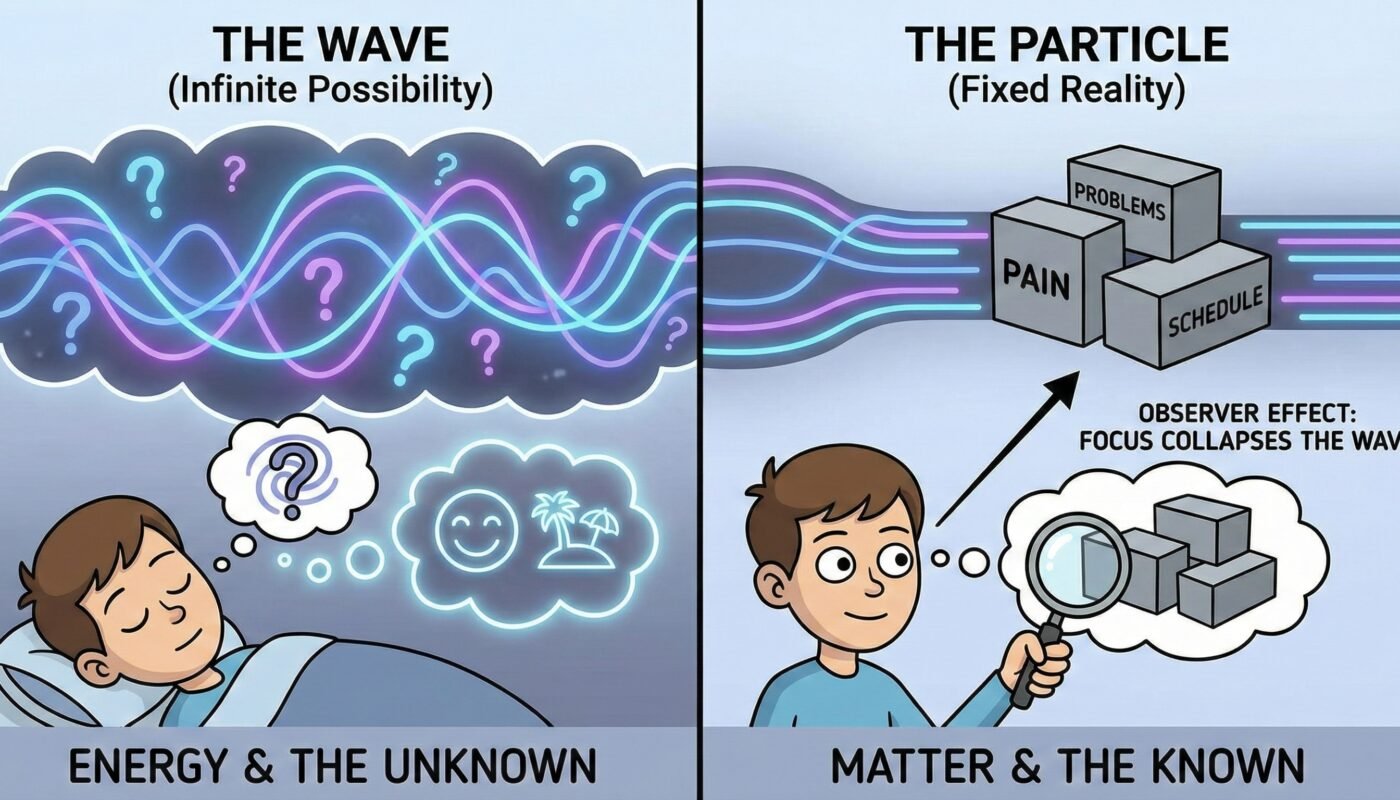 When you wake up and focus on your problems, your pain, and your schedule, you are “observing” your reality into a fixed state. You are collapsing the wave of infinite possibility into the same old particle.