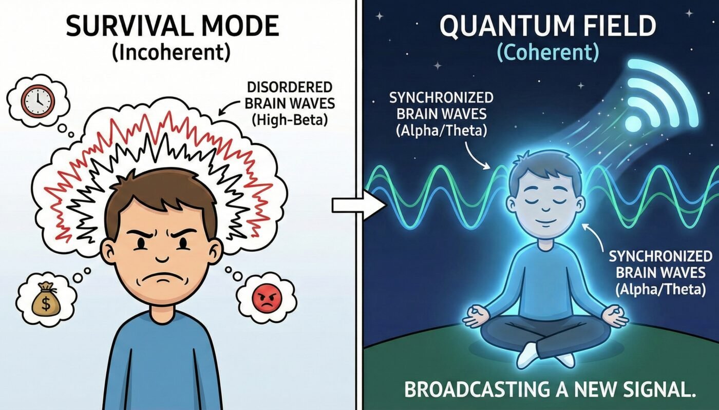 When we live in stress (Survival Mode), our brain waves are disordered and incoherent. We are hyper-focused on our problems, trying to predict the future based on the past. Our brain is fragmented.