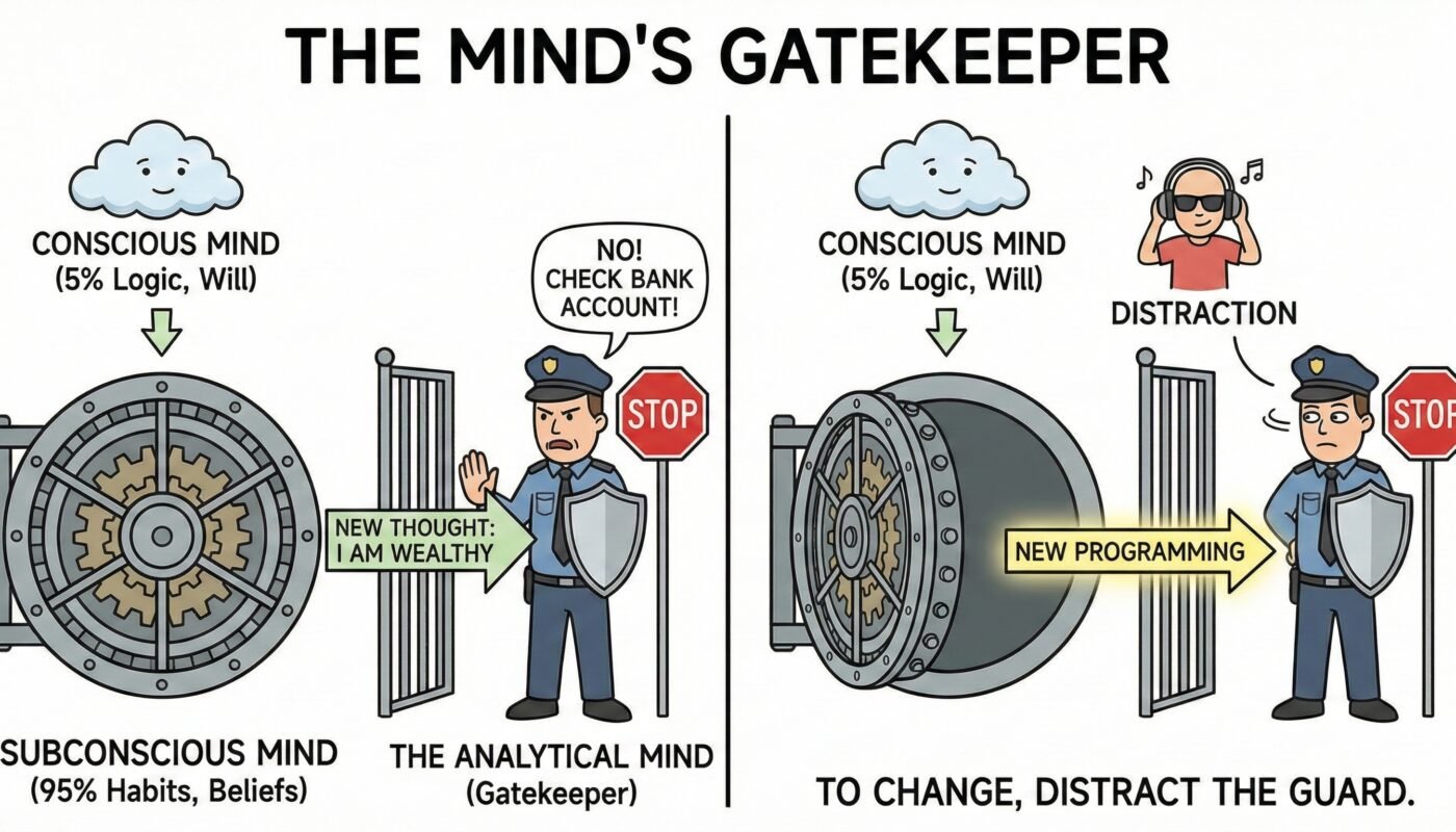 To change your life, you have to distract the guard. You have to lower the volume of the analytical mind so your new programming can slip straight into the subconscious.