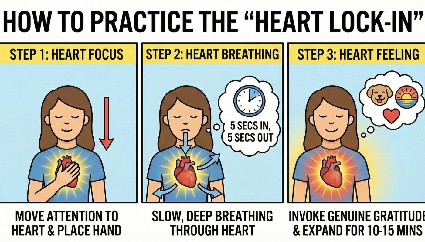 • The Effect: This signals your nervous system to relax and repair. Your brain and heart sync up. You feel clear, focused, and energized. This state is called Heart Coherence.