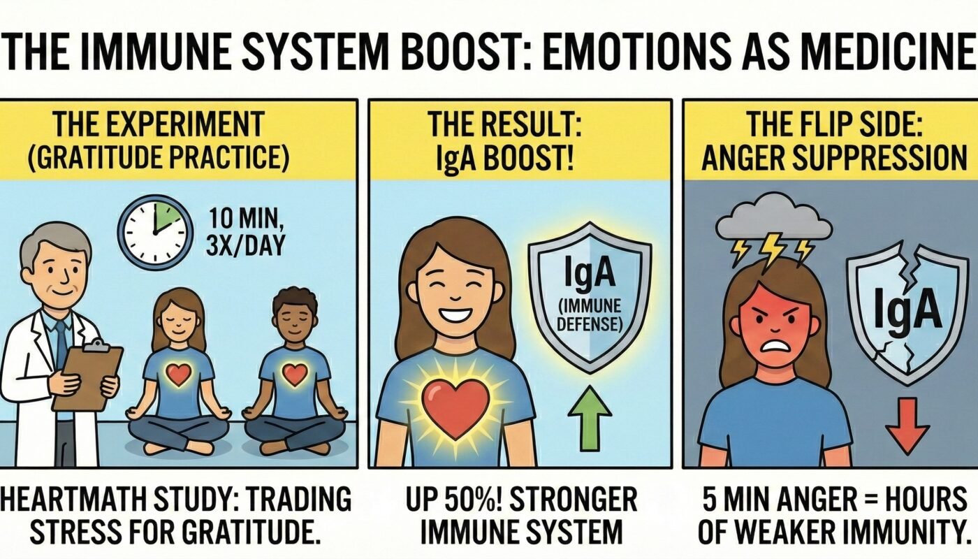 After just a few days of trading stress for gratitude, the participants’ IgA levels shot up by 50%. Their immune systems became significantly stronger simply by changing their emotional state.